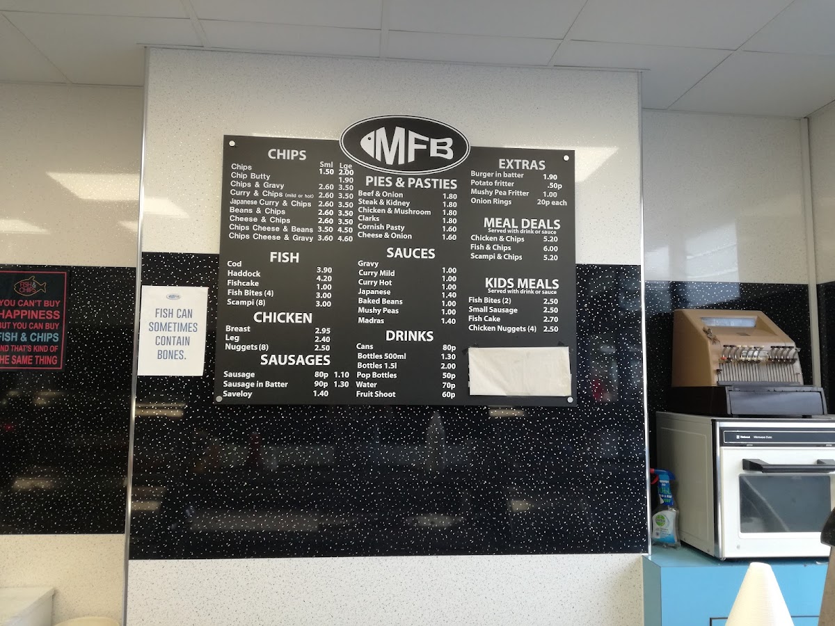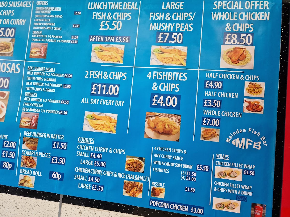 - Accompaniments: Various chip sizes, chip butty, and cone chips
