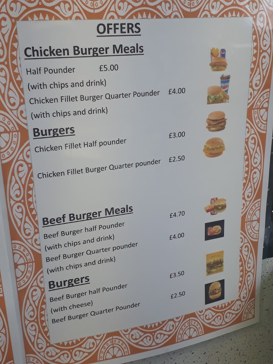Among the familiar favorites, you’ll find freshly prepared cod and haddock, tender chicken fillets, and popular options like chicken curry with chips and rice. The menu also includes smaller, shareable items such as fish bites and rissole to complement a variety of cravings.